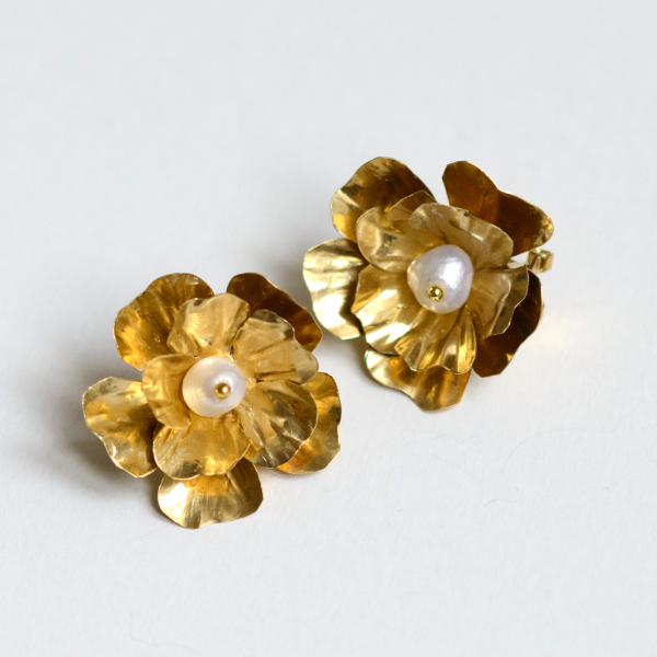 Capas de pétalos de latón modelados enteramente a mano dan vida a nuestras rosas, una pareja de pendientes en los que el trabajo artesanal es el protagonista.