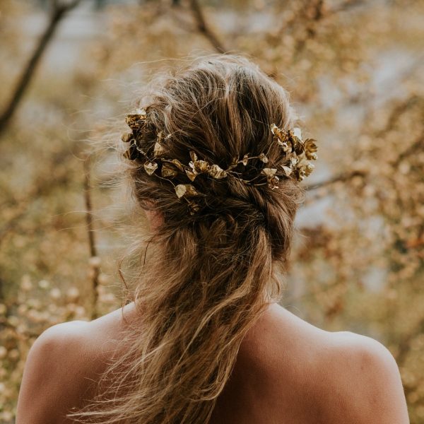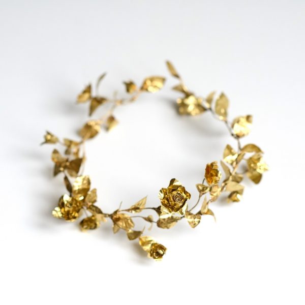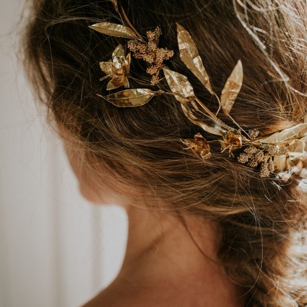 Compuesta por flores y hojas en diferentes metales, bronces, dorados y platas, flores de nácar, pistilos de porcelana perlados, cristal de roca en champagne y ámbar, piedra natural en aguamarina y marrón caramelo y perlitas de río.