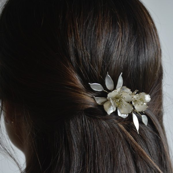 Un prendido asimétrico pero compensado y muy disperso, perteneciente a nuestra colección de cerezo japonés. Ideal para recogidos y semirecogidos.