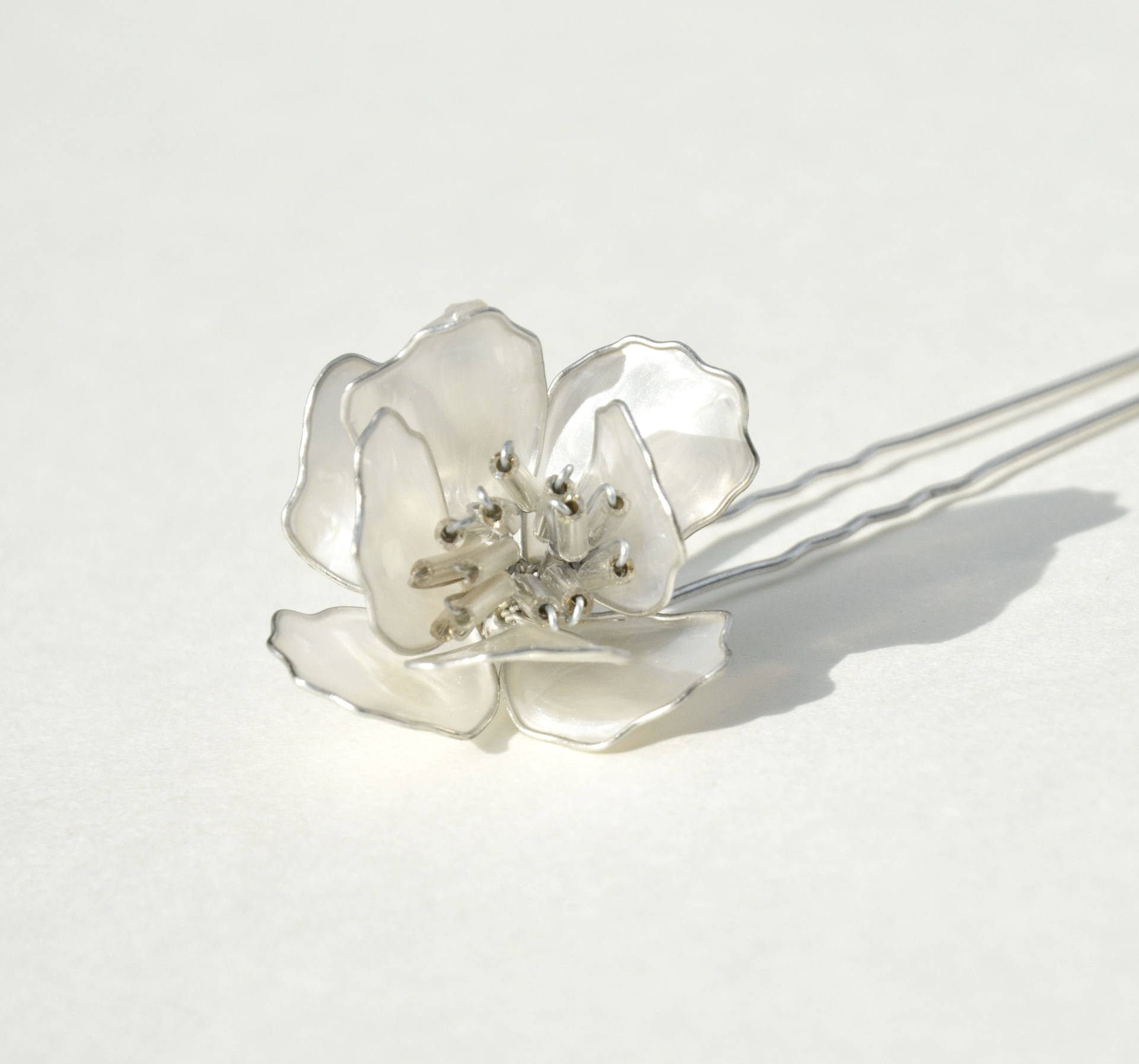 Flor de cerezo japonés modelada de manera completamente manual (sin moldes), en hilo de engarce plata y nácar blanco, con centro de cristales de roca alargados transparentes.