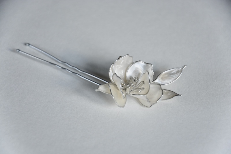 Flor de cerezo japonés con ramita de hojas modelada de manera completamente manual (sin moldes), en hilo de engarce plata y nácar blanco, con centro de cristales de roca alargados transparentes.