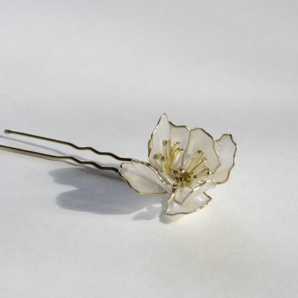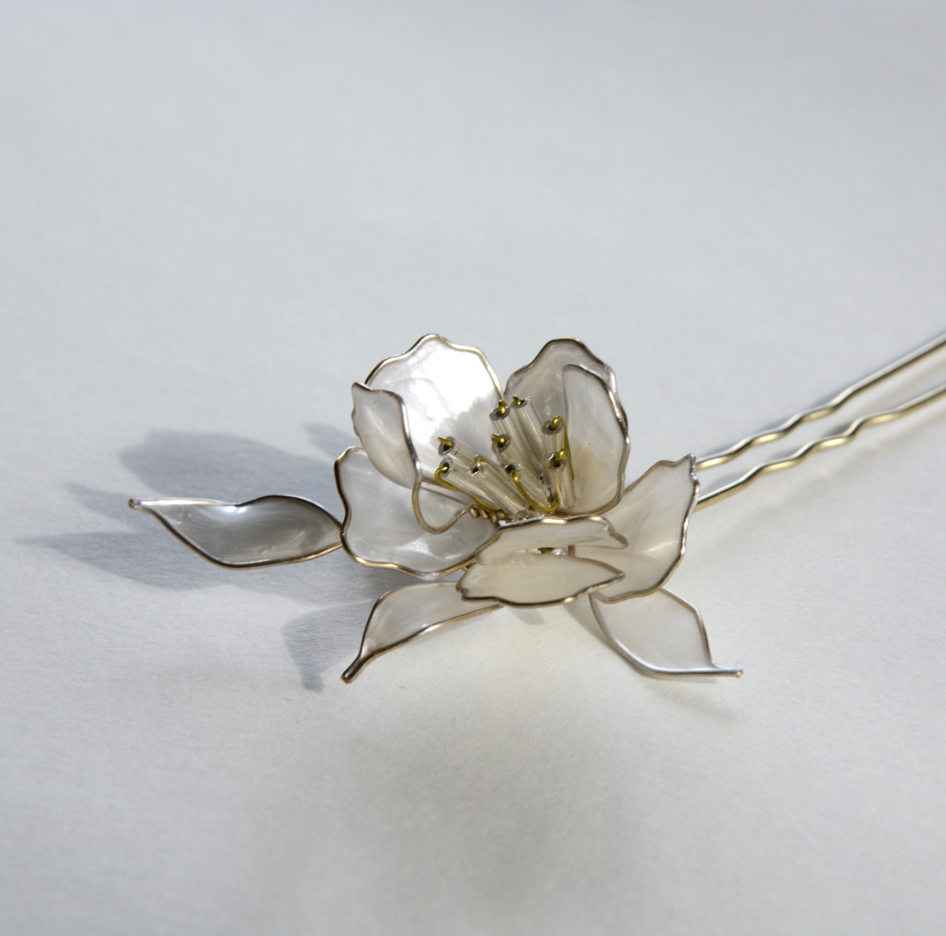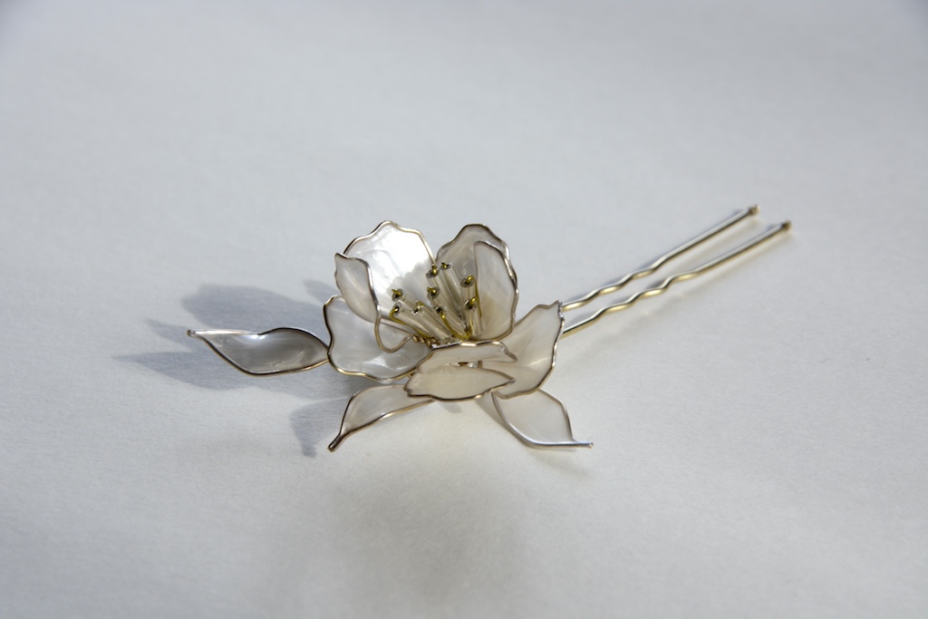 Flor de cerezo japonés con ramita de hojas modelada de manera completamente manual (sin moldes), en hilo de engarce dorado y nácar blanco, con centro de cristales de roca alargados transparentes.