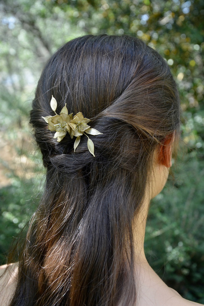 Elementos modelados de manera completamente manual con hilo de engarce dorado, nácar dorado y cristal de roca transparente, peineta dorada como forma de sujeción.