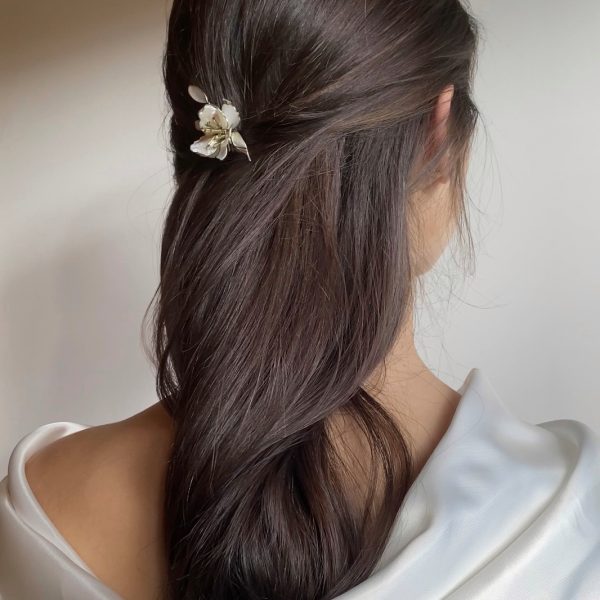 Elementos modelados de manera completamente manual con hilo de engarce plata, nácar blanco y cristal de roca transparente, peineta plateada como forma de sujeción.