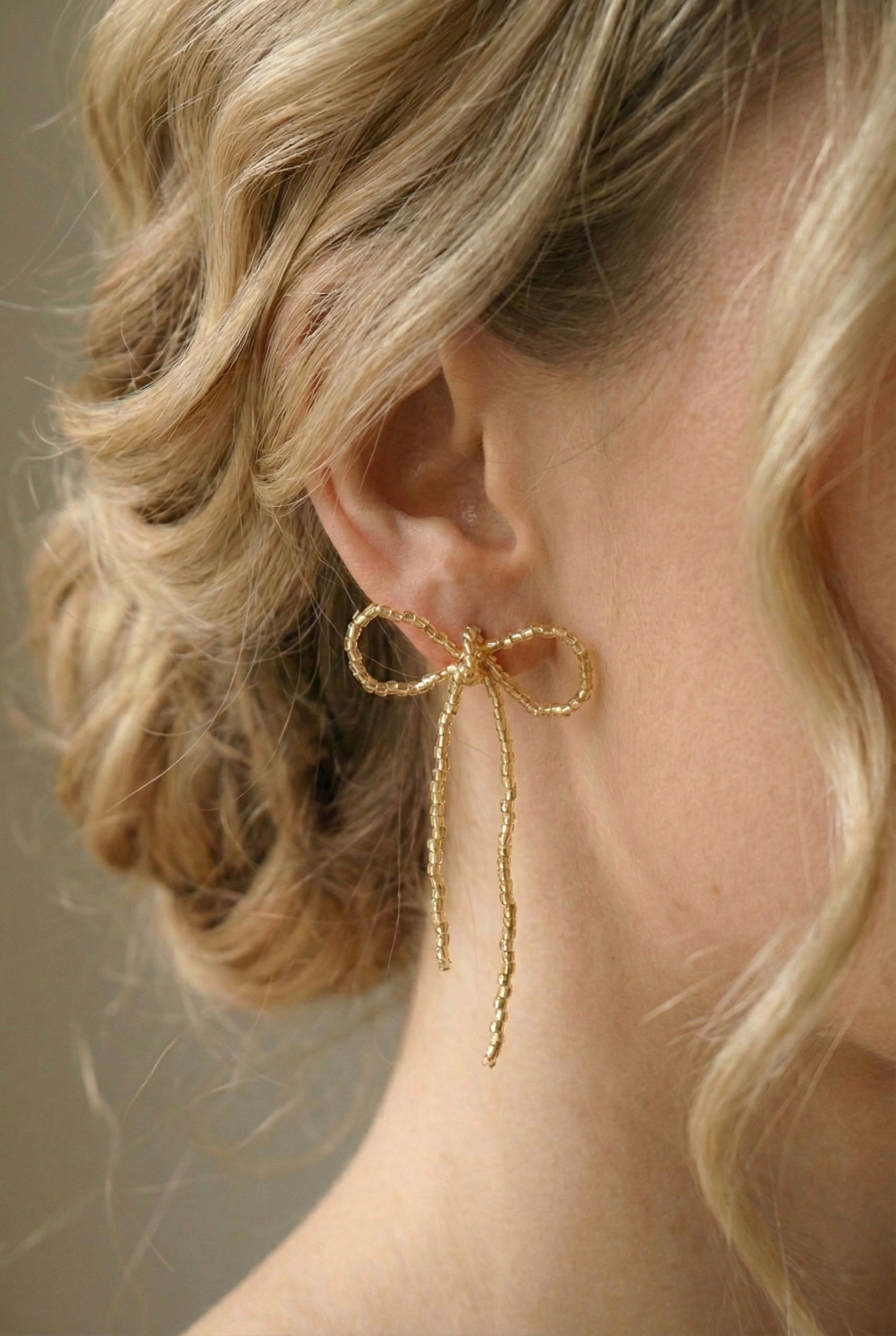 Nuestros pendientes lazo dorado monocromáticos son la elección perfecta para elevar cualquier look de invitada, largos y con preciosa caída y movimiento.